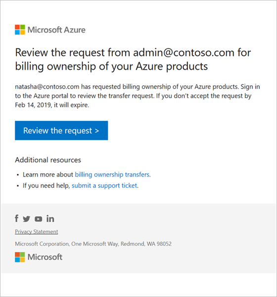 用户将收到一封电子邮件,其中包含查看转让请求的说明。 选择“查看请求”,在 Azure 门户中打开它。