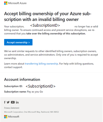 当某个订阅不再具有有效的计费帐户所有者时,Azure 会向其他计费帐户所有者和订阅所有者发送电子邮件,告知他们该情况,并向他们提供一个链接,供他们接受订阅的计费所有权。 任何用户都可选择该链接来接受计费所有权。 有关计费角色的详细信息,请参阅 计费角色 和 Azure 角色、Microsoft Entra 角色和经典订阅管理员角色。