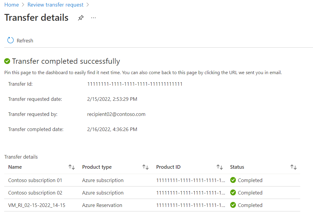 Transfer is in progress消息。 转移成功完成后,会出现“转移详细信息”页,其中包含Transfer completed successfully消息。