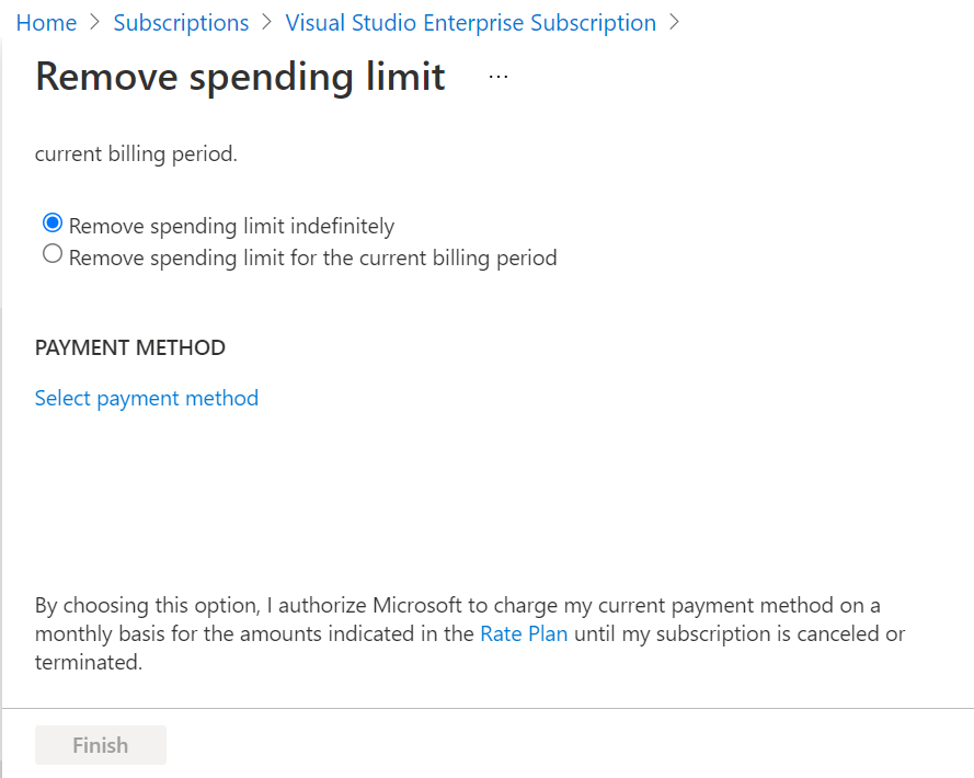 只要 Azure 订阅关联了有效的付款方法,即可随时移除支出限制。 对于具有多个月额度的订阅类型(例如 Visual Studio Enterprise 和 Visual Studio Professional),你可以选择无限期移除支出限制,也可以只移除当前计费周期的支出限制。 如果你只选择当前计费周期,则在下一个计费周期开始时将自动启用支出限制。