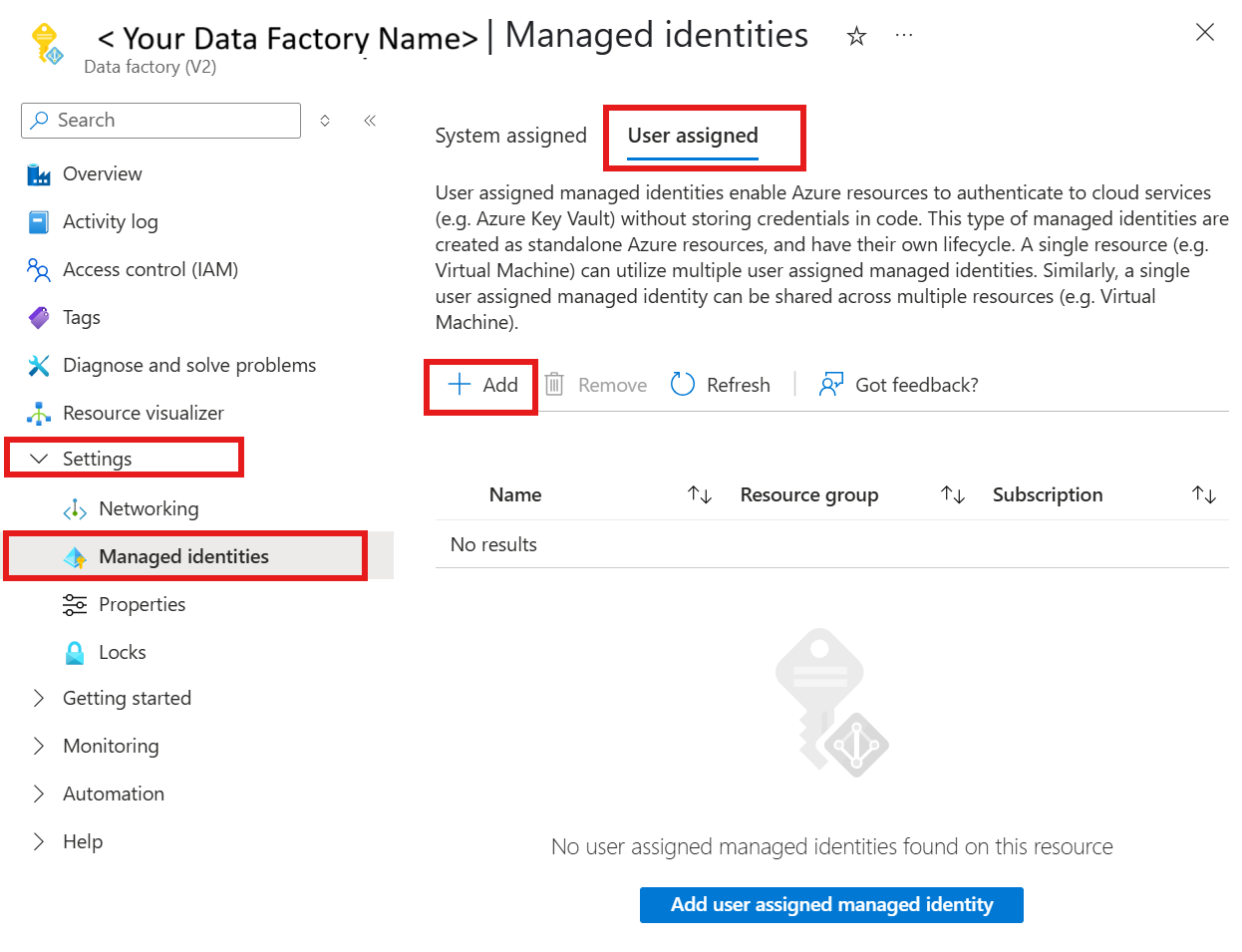 数据工厂或 Synapse 工作区可与系统分配的托管标识相关联。 了解详细信息, 生成系统分配的托管标识