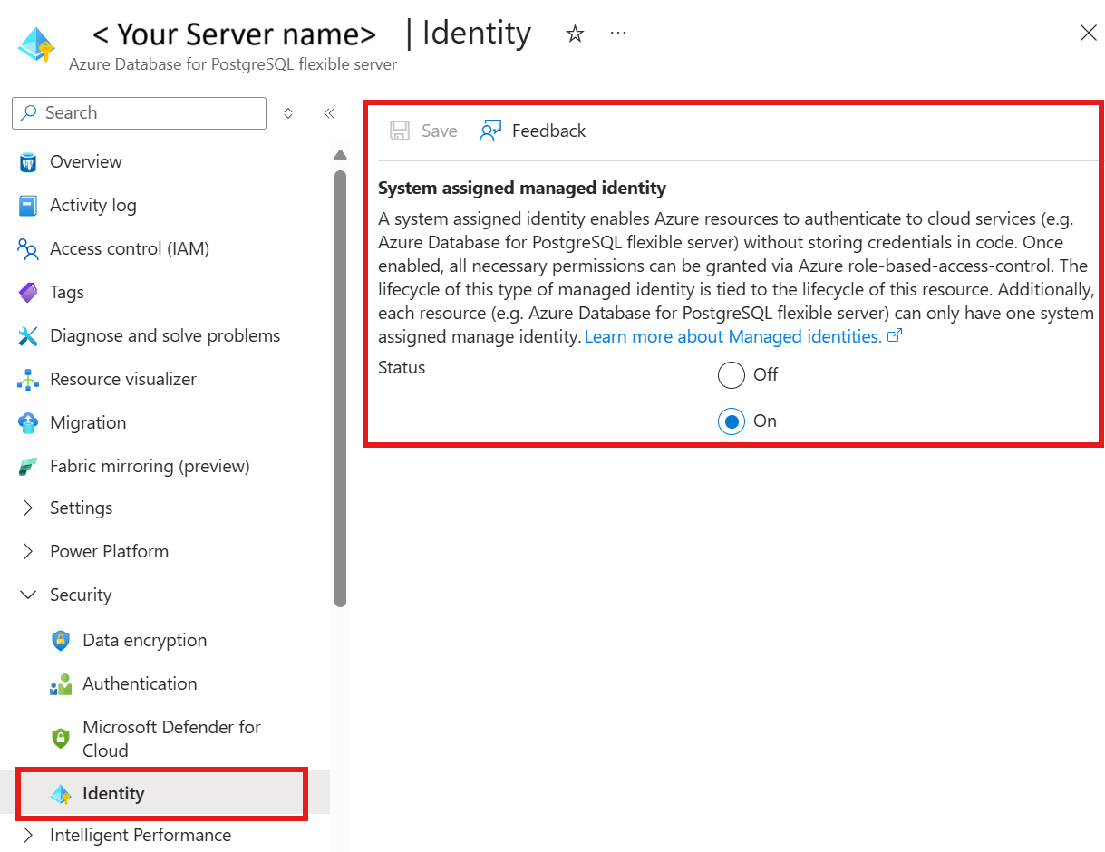 为 Azure Database for PostgreSQL 将系统分配的托管标识设为“开”。