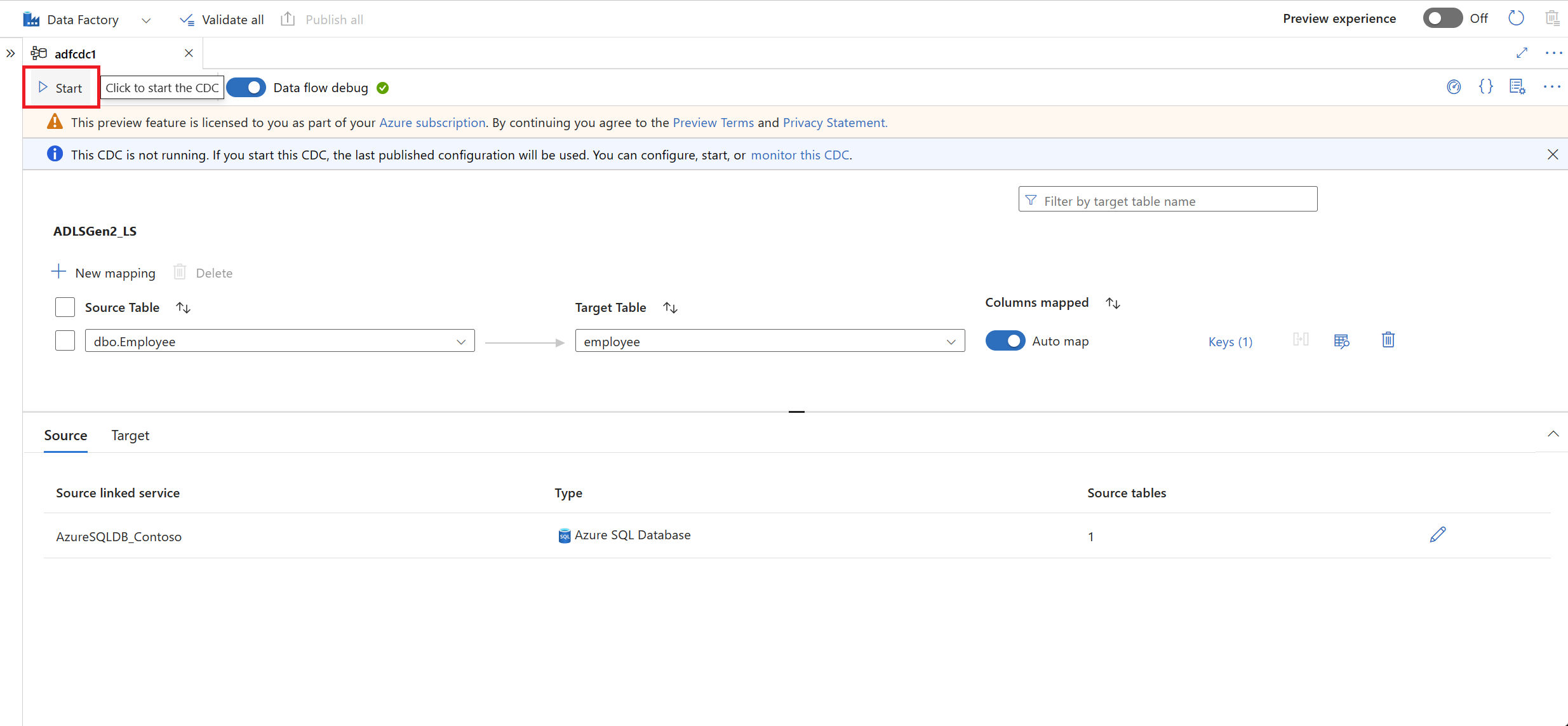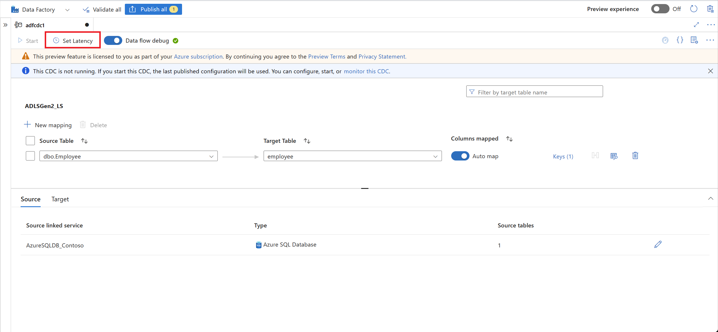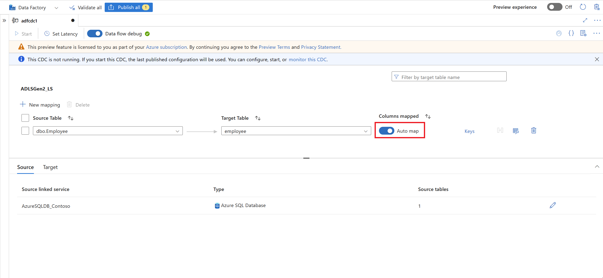 选择表后,默认情况下会映射表的列,并启用“自动映射”开关。 自动映射会在接收器中自动按名称映射列,在源架构演变时拾取新的列更改,并将此信息流向受支持的接收器类型。