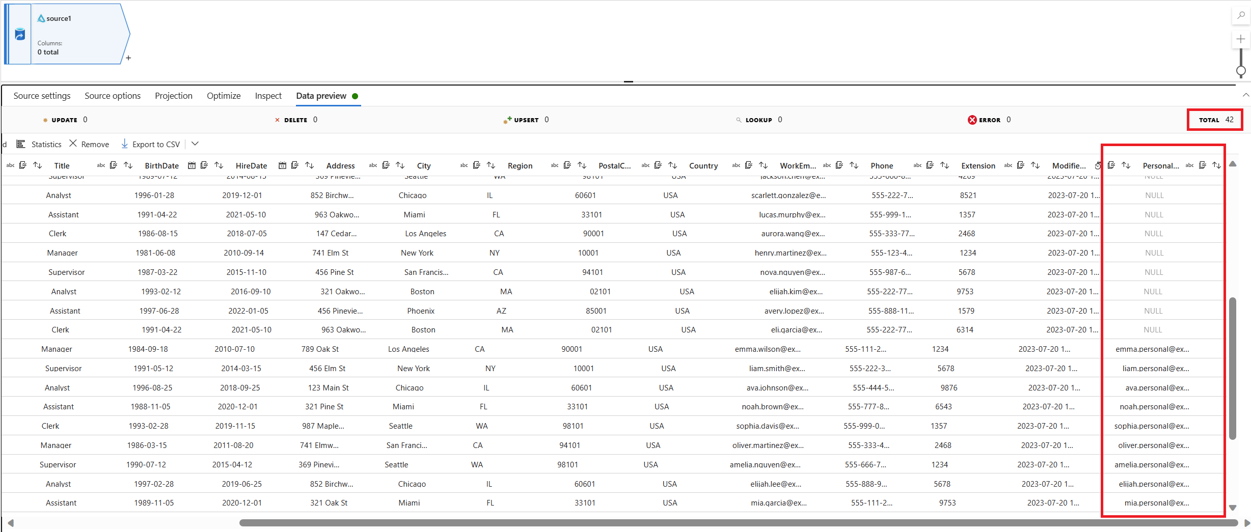 ALTER TABLET-SQL 语句将新的“PersonalEmail”列添加到源表,如以下示例所示。