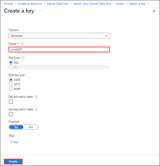 如果要创建新密钥,请选择“创建新密钥”。 必须使用 RSA 密钥。 大小可以是 2048 或更大。 输入新密钥的名称,接受其他默认值,然后选择“创建”。