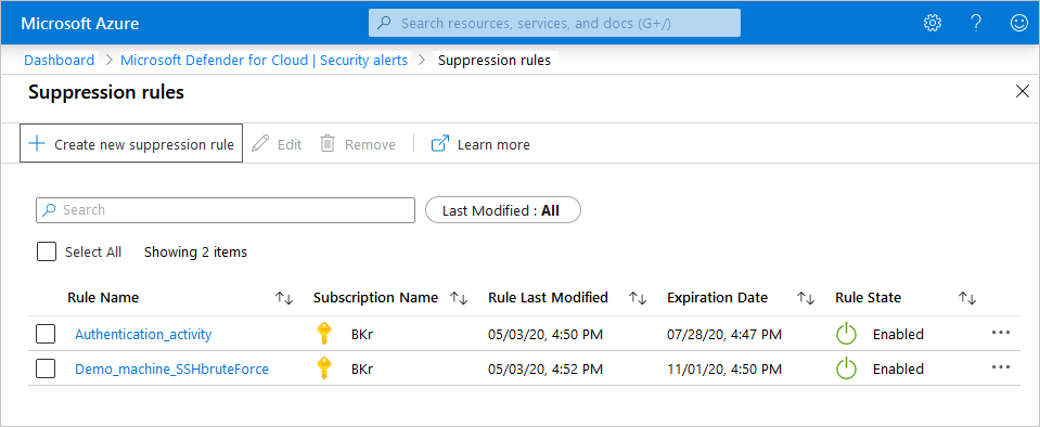 在 Defender for Cloud“安全警报”页中,选择页面顶部的“抑制规则”。