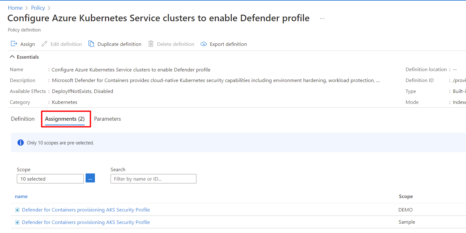 部署 Defender 传感器后,会自动分配默认工作区。 可以通过 Azure Policy 分配一个自定义工作区来代替默认工作区。