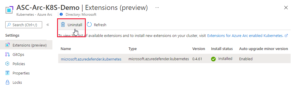 显示用于从已启用 Azure Arc 的 Kubernetes 群集卸载扩展的按钮的屏幕截图。