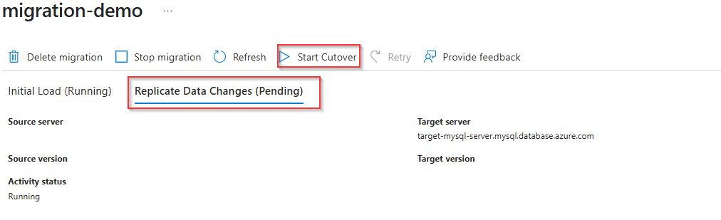 Once the initial data ingestion completes, monitor the Seconds behind source field under the Replicate Data Changes tab. As soon as it's 0, proceed to start the cutover by navigating to the Start Cutover button at the top of the migration activity screen. Select Refresh to update the display and view the seconds behind the source when needed.