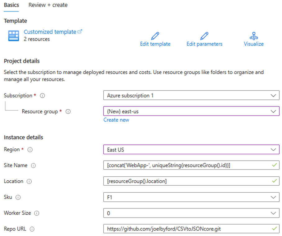 在与 Azure 门户关联的浏览器中,打开 GitHub 存储库 URL - https://github.com/joelbyford/CSVtoJSONcore。