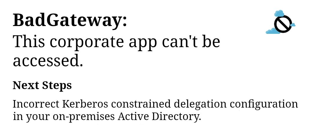 如果看到 BadGateway Incorrect Kerberos 错误,请以管理员身份在域控制器的 Windows PowerShell 中运行以下命令。将 [servername] 和 [serviceaccount] 替换为您环境中的实际值。