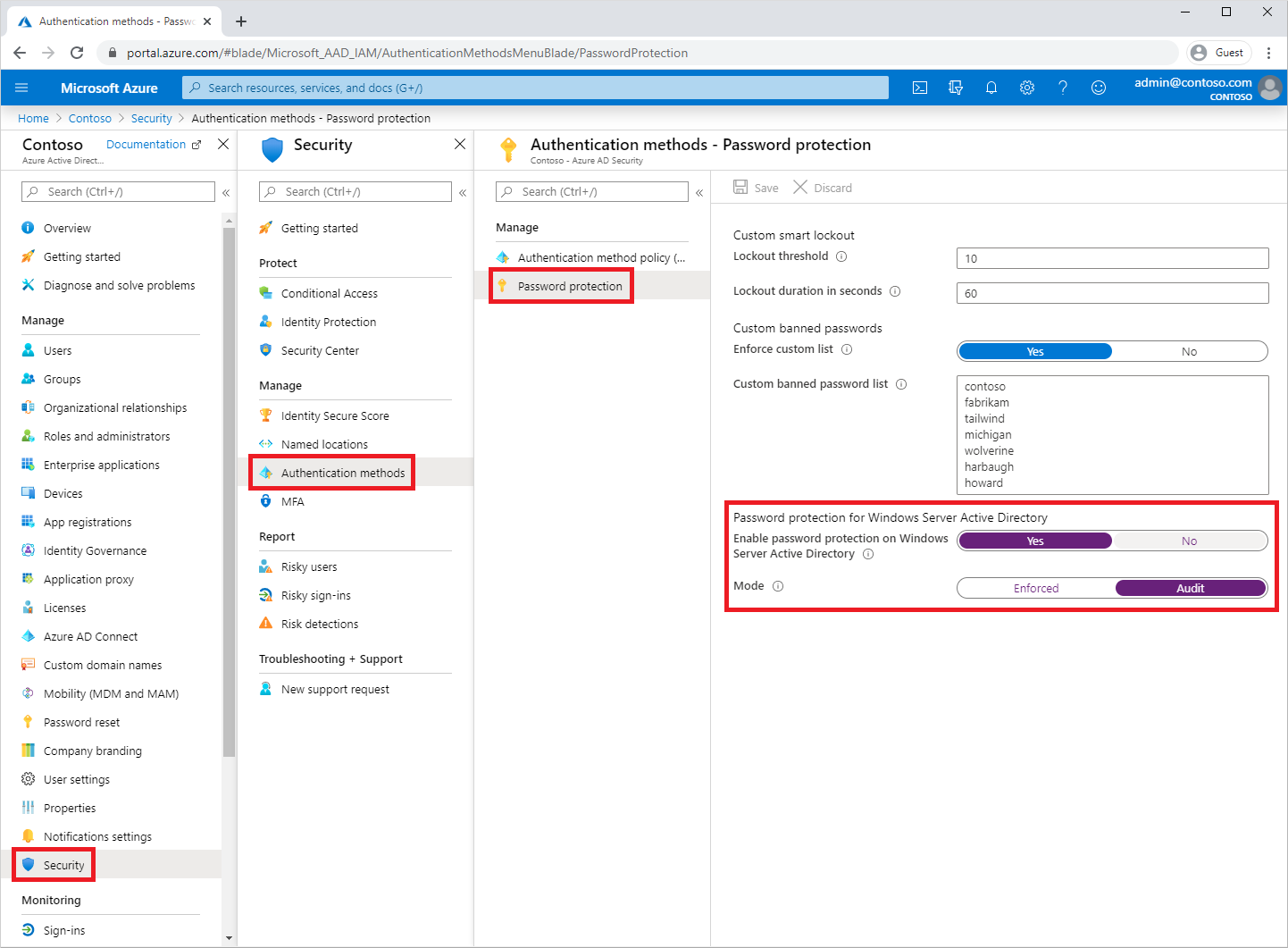 启用本地 Microsoft Entra 密码保护时,可以使用“审核”模式或“强制”模式。 建议初始部署和测试始终以审核模式启动。 然后,应监视事件日志中的条目,以预测在启用 强制 模式后是否会对任何现有运营流程造成干扰。
