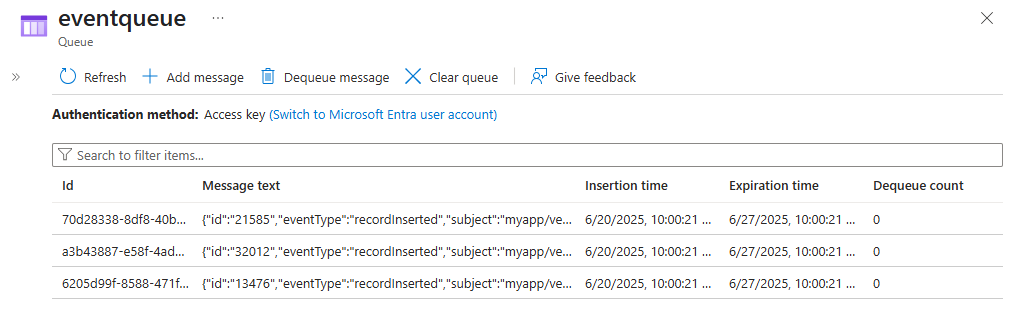 转到 Azure 门户中的队列,会看到事件网格将这三个事件发送到队列。
