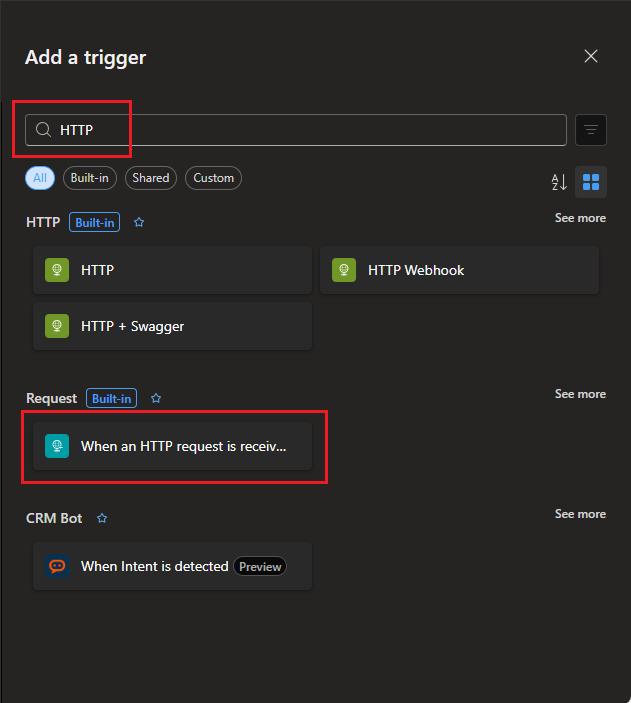 滚动浏览结果并选择“请求 - 当收到 HTTP 请求时”作为触发器。