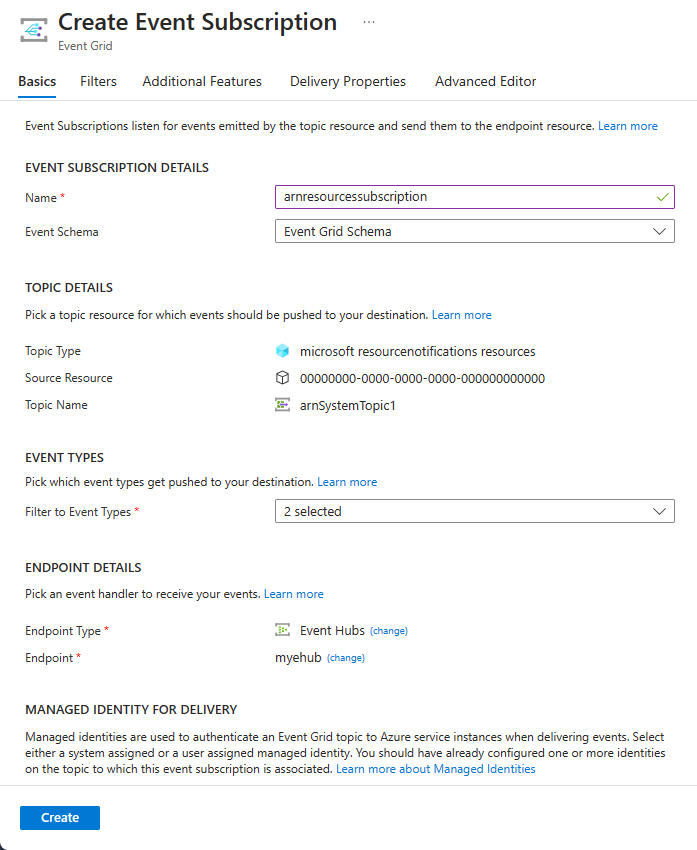 az eventgrid system-topic create命令创建microsoft.resourcenotifications.resources类型的系统主题。az eventgrid system-topic create \ --name SYSTEMTOPICNAME \ --resource-group RESOURCEGROUPNAME \ --source /subscriptions/AZURESUBSCRIPTIONID \ --topic-type microsoft.resourcenotifications.resources \ --location Global