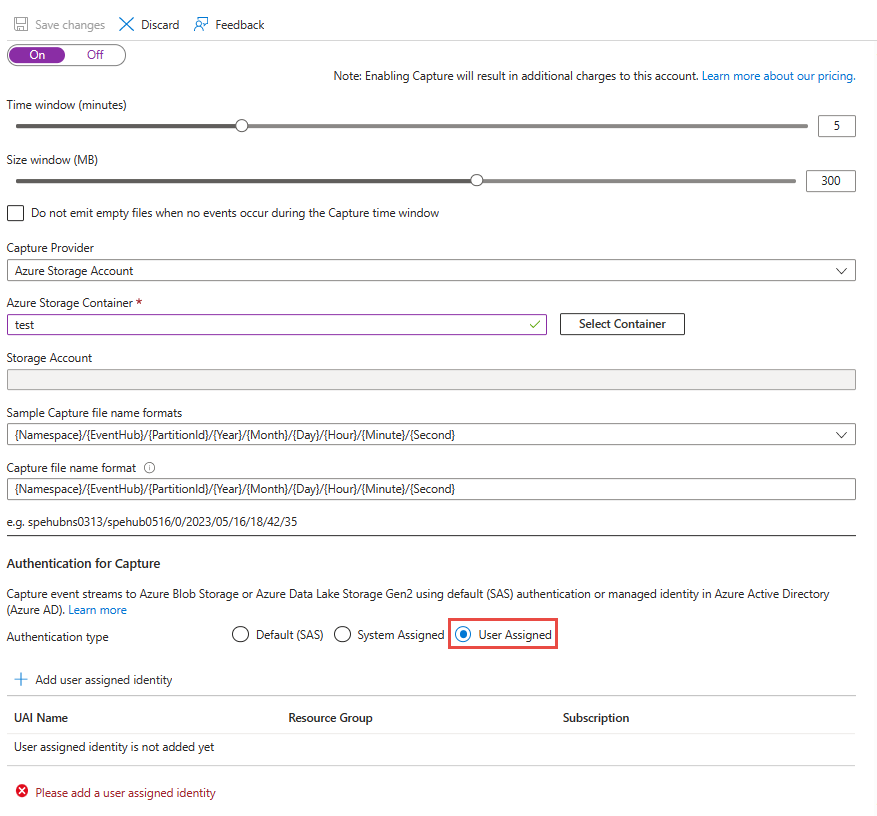 然后,可以在事件中心启用捕获功能时选择 User Assigned 托管标识选项,并在启用捕获功能时分配所需的用户分配标识。