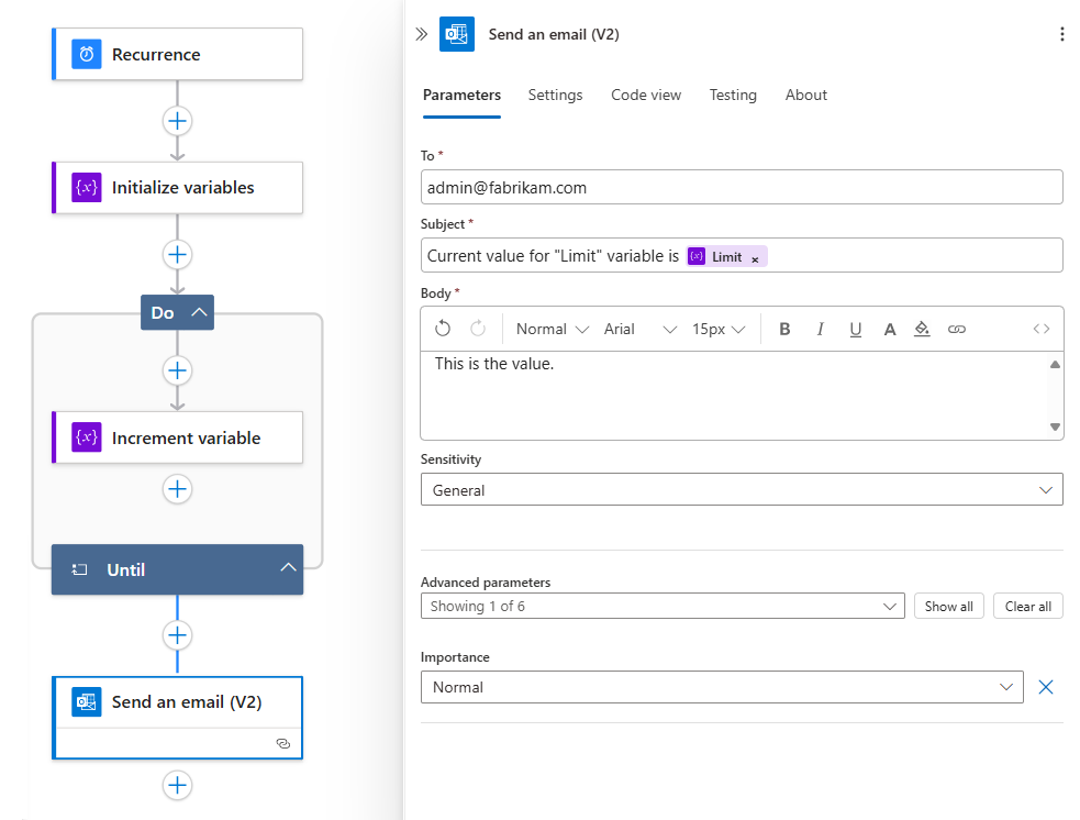 参数 值 限制 选择“Limit”变量。 值 1 在 “直到 ”作外部和“直到”作下,按照以下常规步骤添加在 消耗 或 标准 逻辑应用工作流中发送电子邮件的作。