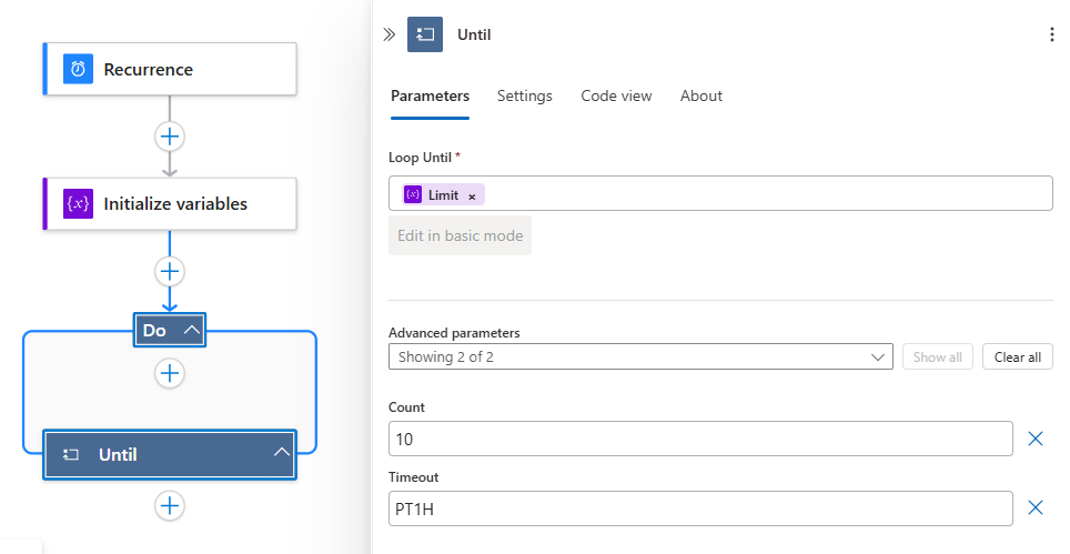 operationOptions的参数并将值设置为FailWhenLimitsReached来更改循环的 JSON 定义中的默认行为,例如:"Until": { "actions": { "Execute_stored_procedure": { <...> } }, "expression": "@equals(variables('myUntilStop'), true)", "limit": { "count": 5, "timeout": "PT1H" }, "operationOptions": "FailWhenLimitsReached", "runAfter": { "Initialize_variable_8": [ "Succeeded" ] }, "type": "Until" }