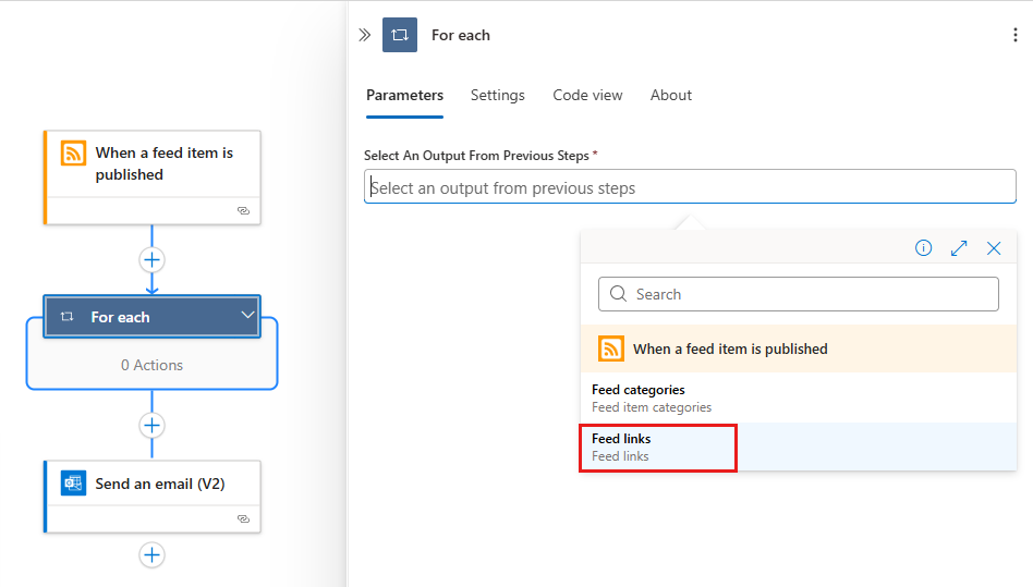 按照相同的常规步骤在 RSS 触发器和工作流中发送电子邮件作之间添加 For each作。