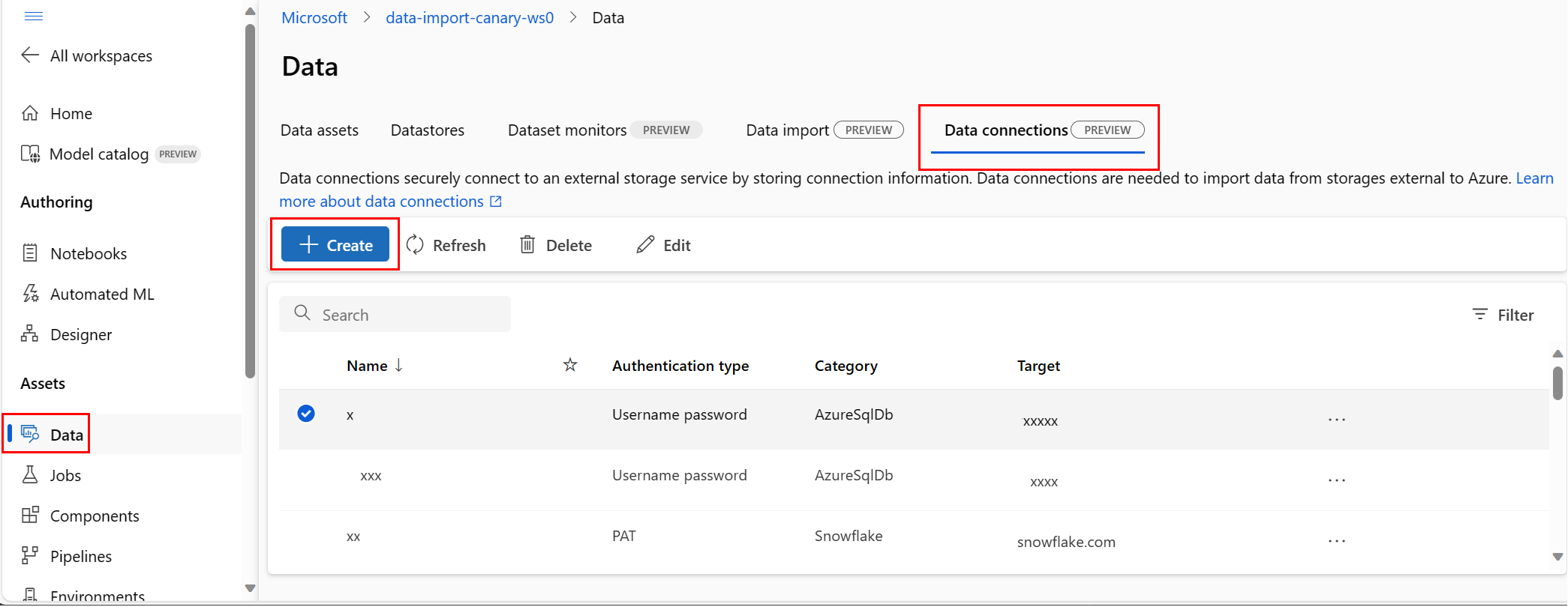 在左侧导航栏的“资产”下,选择“数据”。 接下来,选择“数据连接”选项卡。然后选择“创建”,如下方的屏幕截图所示: