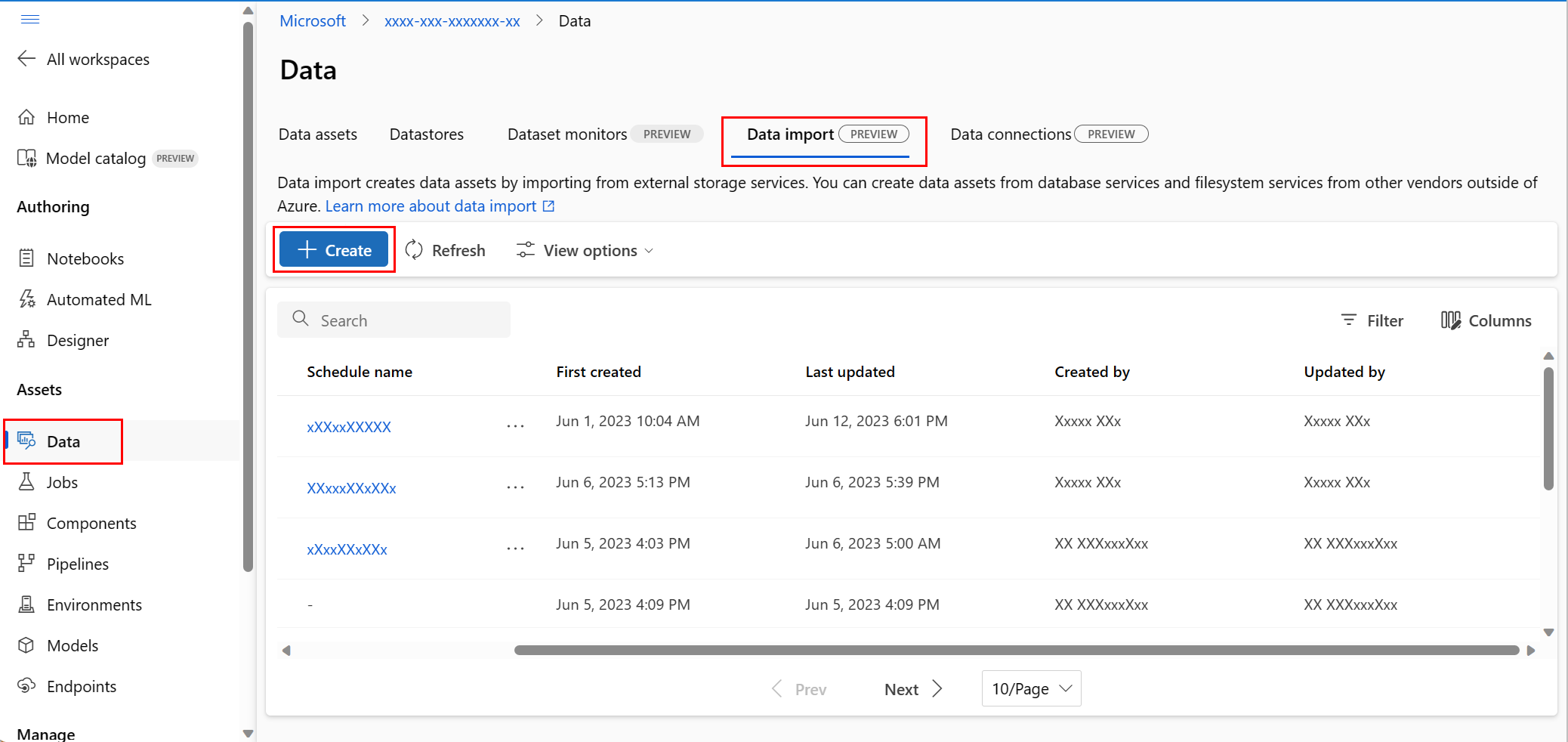 在左侧导航栏的“资产”下,选择“数据”。 接下来,选择“数据导入”选项卡。然后选择“创建”,如以下屏幕截图所示:
