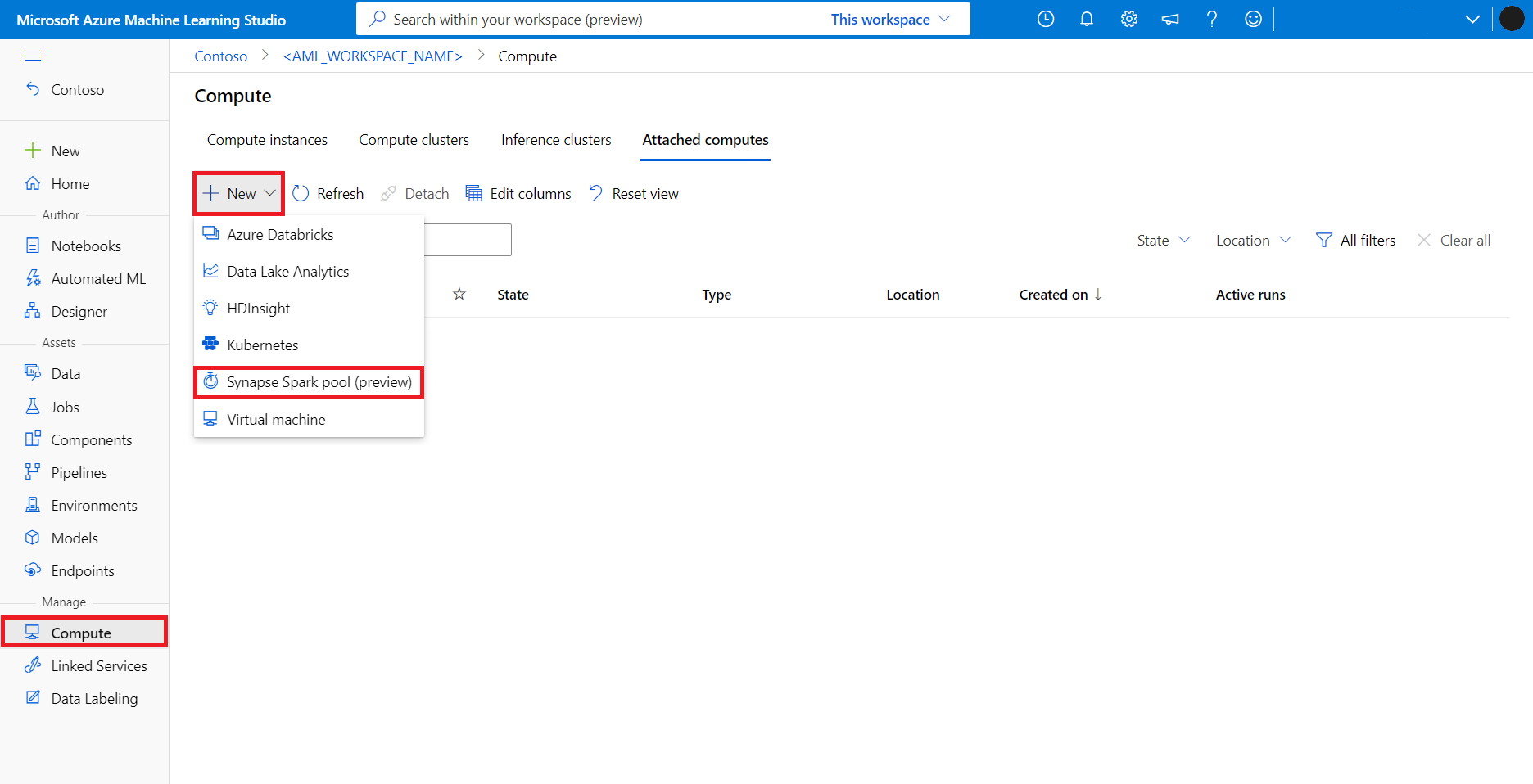 Azure 机器学习工作室 UI 还提供了一种用于分离附加的 Synapse Spark 池的方法。 为此,请按照下列步骤进行操作: