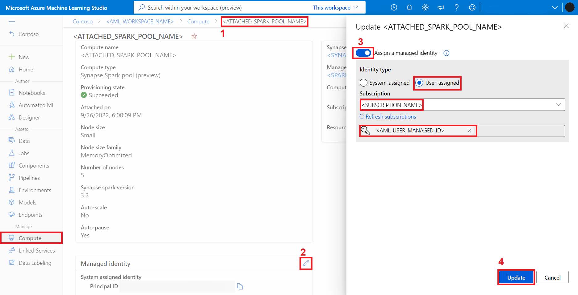 可以从 Azure 机器学习工作室 UI 管理附加的 Synapse Spark 池。 Spark 池管理功能包括附加的 Synapse Spark 池的相关托管标识更新。 可以在更新 Synapse Spark 池时分配系统分配的标识或用户分配的标识。 在将用户分配的托管标识分配给 Synapse Spark 池之前,应在 Azure 门户中创建一个用户分配的托管标识