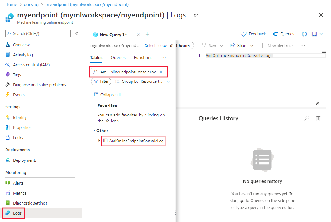- Go to the properties page for your online endpoint. Under Monitoring, select Logs.