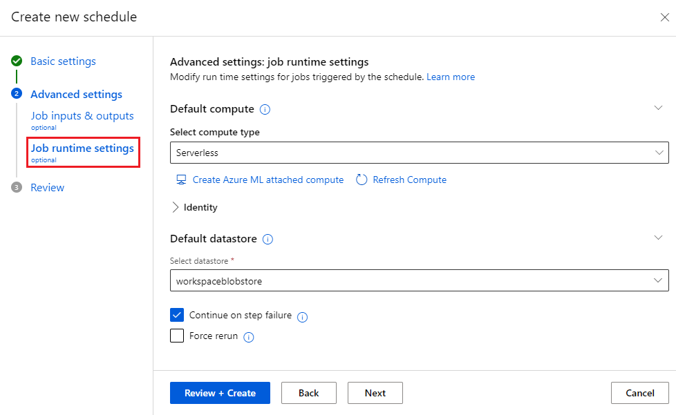 - CLI 和 SDK v2 计划支持指定包含多个触发时间戳的复杂重复周期模式。 工作室 UI 会显示复杂模式,但不支持对其进行编辑。