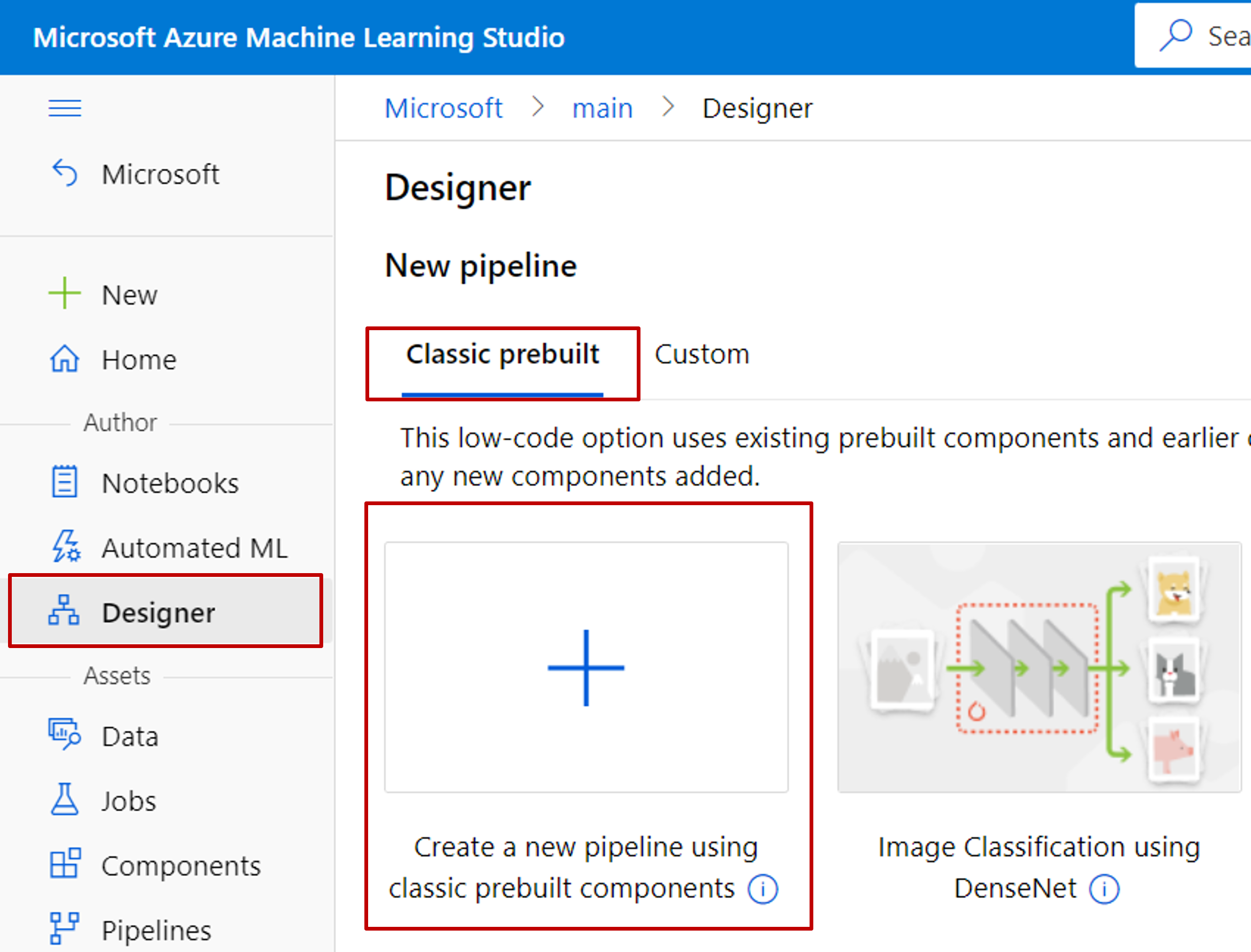 从边栏菜单中选择 设计器 。 在 “经典预生成”下,选择 “使用经典预生成组件创建新管道”。