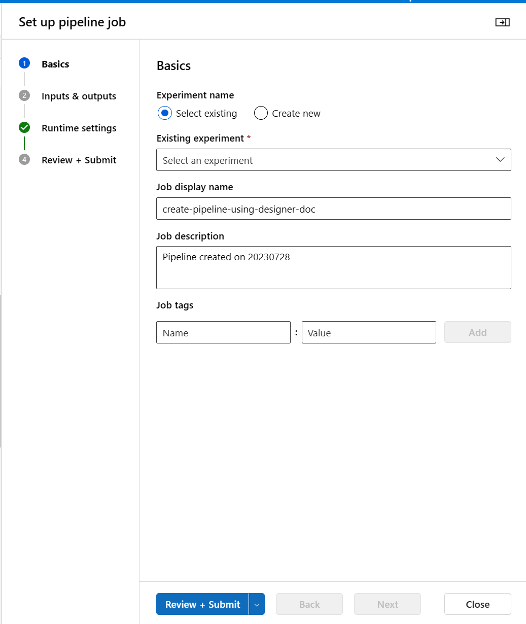 “审阅 + 提交”步骤是在提交之前审阅所有设置的最后一步。 如果您曾经提交过管道,向导会记住您的最后一个配置。