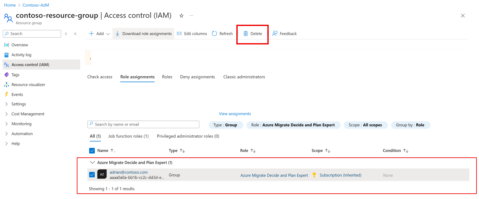 Azure Migrate 所有者只能删除 Azure Migrate 决定和计划专家和 Azure Migrate 执行专家角色分配。 订阅或资源组所有者可以删除 Azure Migrate 所有者角色分配。
