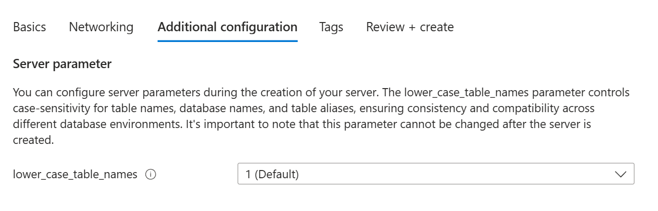如果使用的是 MySQL 5.7 版本,则 Azure Database for MySQL 灵活服务器中 lower_case_table_names 的默认值为 1。 尽管可以将支持的值更改为 2,但不允许从 2 重新还原为 1。 有关更改默认值的帮助,请创建支持票证。