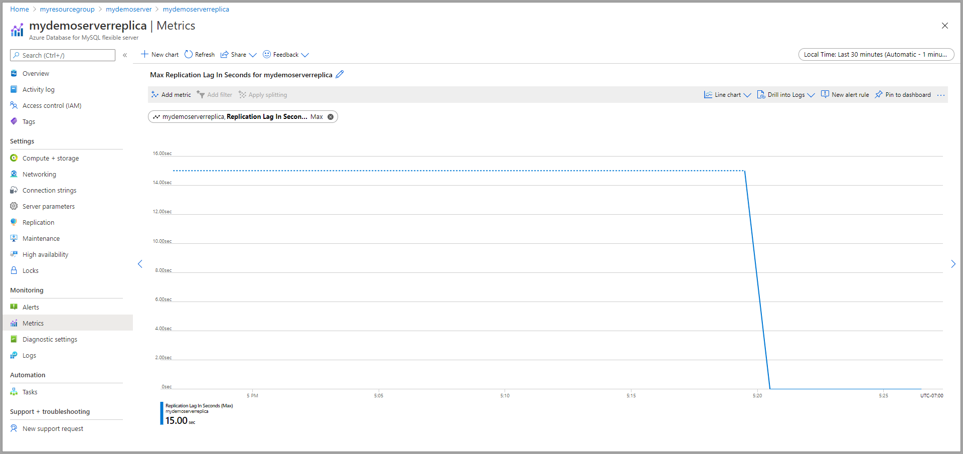 查看所选时间范围的复制延迟时间。 下图显示过去的 30 分钟。