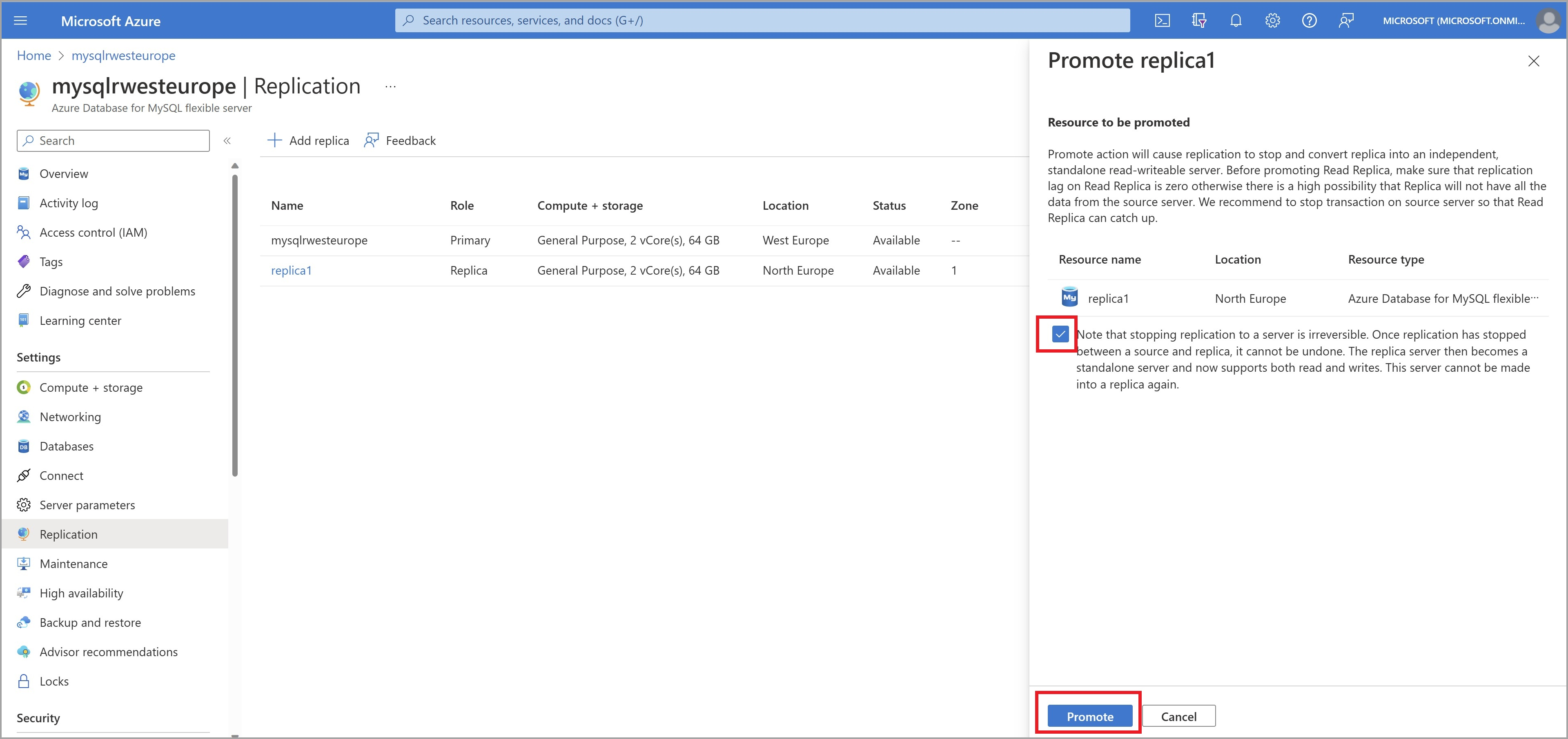 选择“提升”。 升级操作导致复制停止,并将副本转换为独立的可读写服务器。