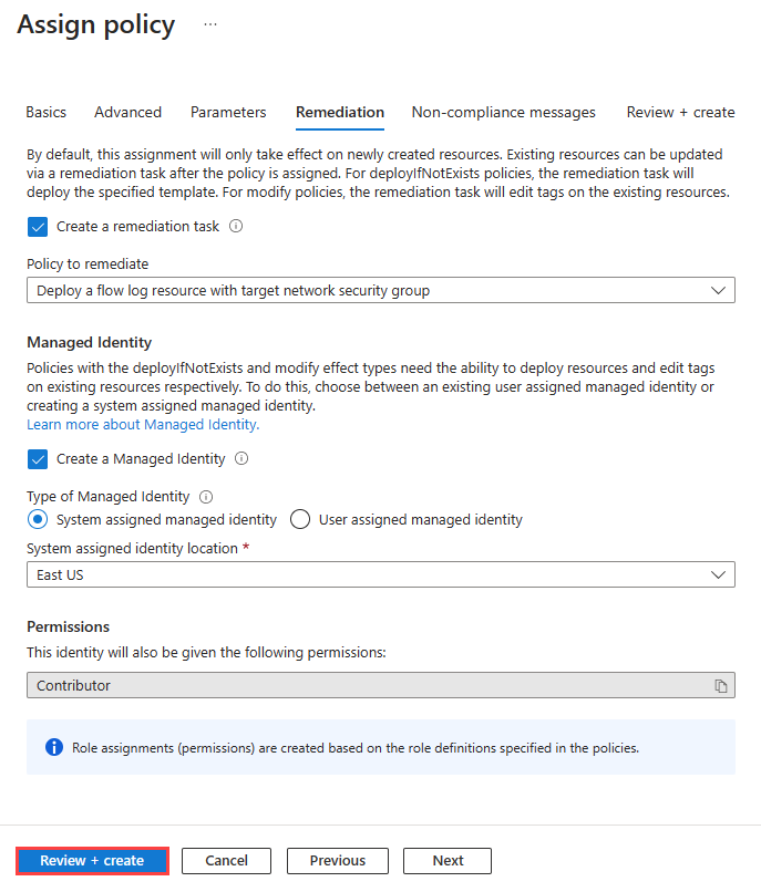 设置 值 创建修正任务 如果你希望策略影响现有资源,请选中该复选框。 创建托管标识 选中复选框。 托管标识类型 选择要使用的托管标识的类型。 系统分配的标识位置 选择系统分配标识的区域。 范围 选择用户分配标识的范围。 现有的用户分配标识 选择用户分配的标识。 注意