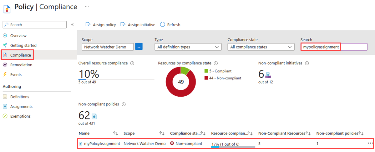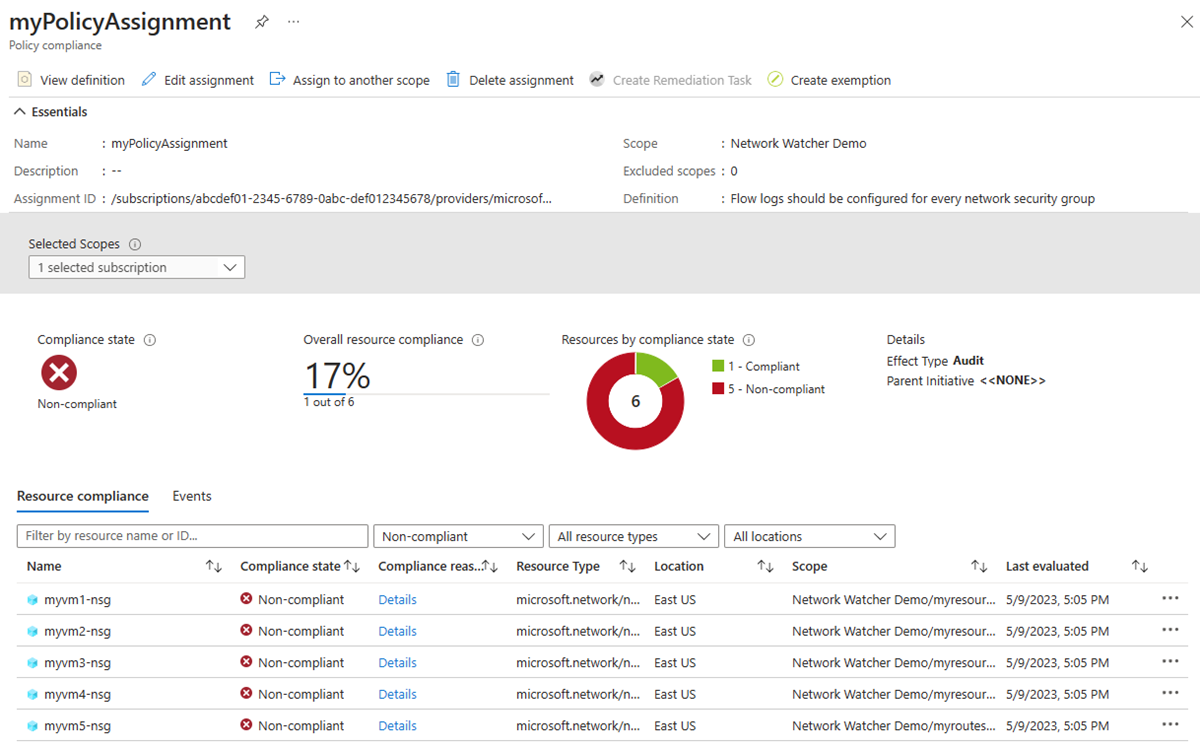 让策略保持运行,以评估并部署所有不合规网络安全组的流日志。 然后再次选择“资源合规性”以检查网络安全组的状态(如果策略已完成修正,将不会显示不合规的网络安全组)。