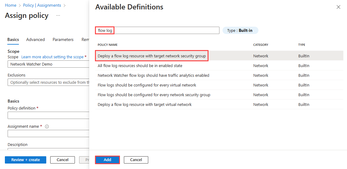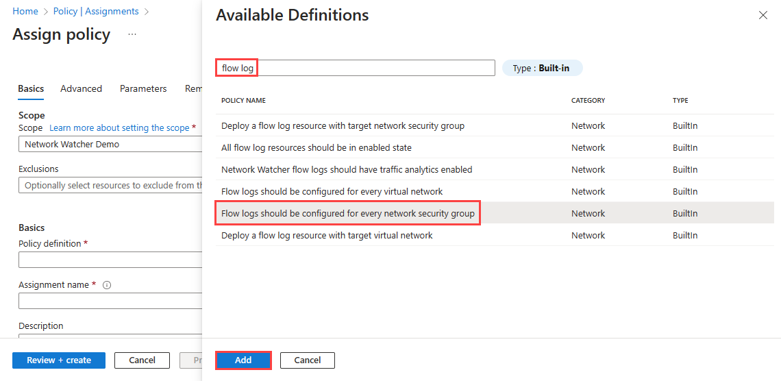 选择“策略定义”旁边的省略号 (...),然后选择要分配的内置策略。 在搜索框中输入“流日志”,然后选择“内置”筛选器。 在搜索结果中,选择“使用目标网络安全组部署流日志资源”,然后选择“添加”。
