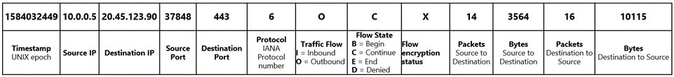 - 每条日志记录都包含流应用到的网络接口、5 元组信息、流量方向、流状态、加密状态和吞吐量信息。
