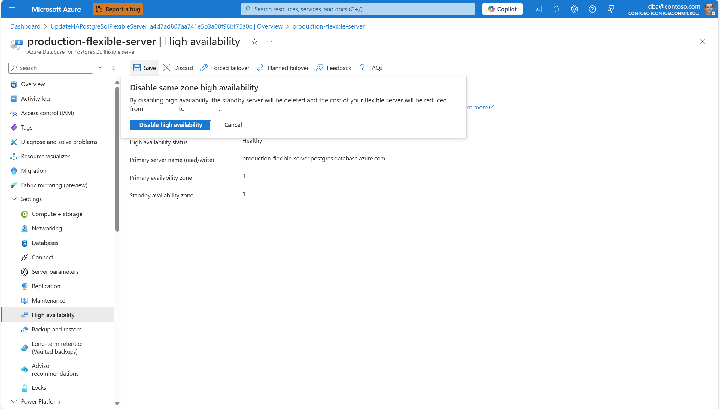 对话框显示与删除备用服务器相关的成本降低。 如果决定继续,请选择“禁用高可用性”。