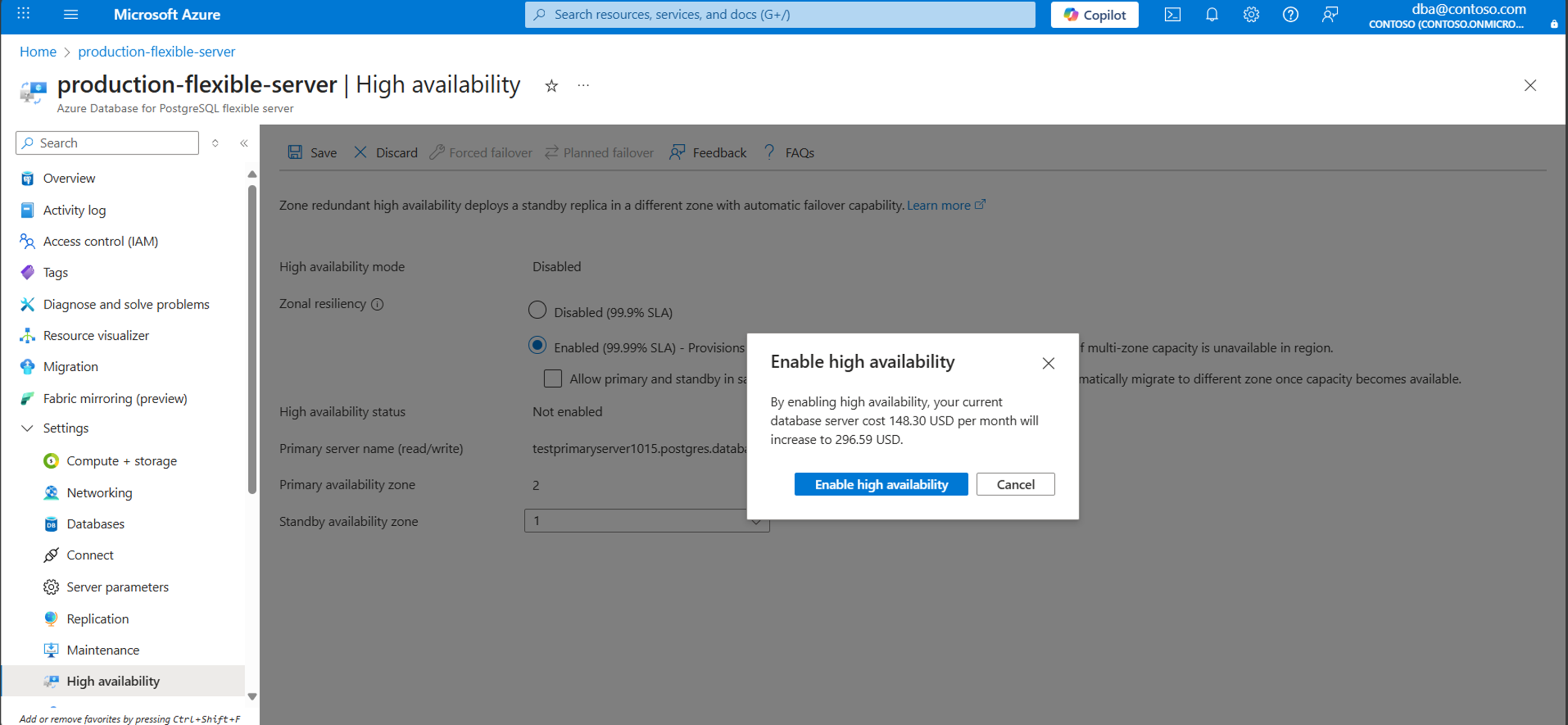 对话框显示与备用服务器的部署相关的成本增加。 如果决定继续,请选择“启用高可用性”。