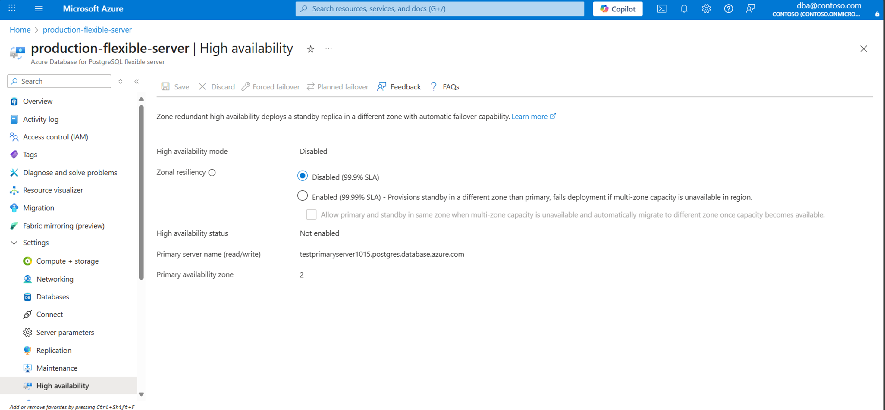 如果在包含单个可用性区域的区域中部署服务器,则只能在同一区域模式下启用高可用性。 如果区域将来使用多个可用性区域进行增强,则可以部署配置为同一区域或区域冗余的高可用性的新 Azure Database for PostgreSQL 灵活服务器实例。