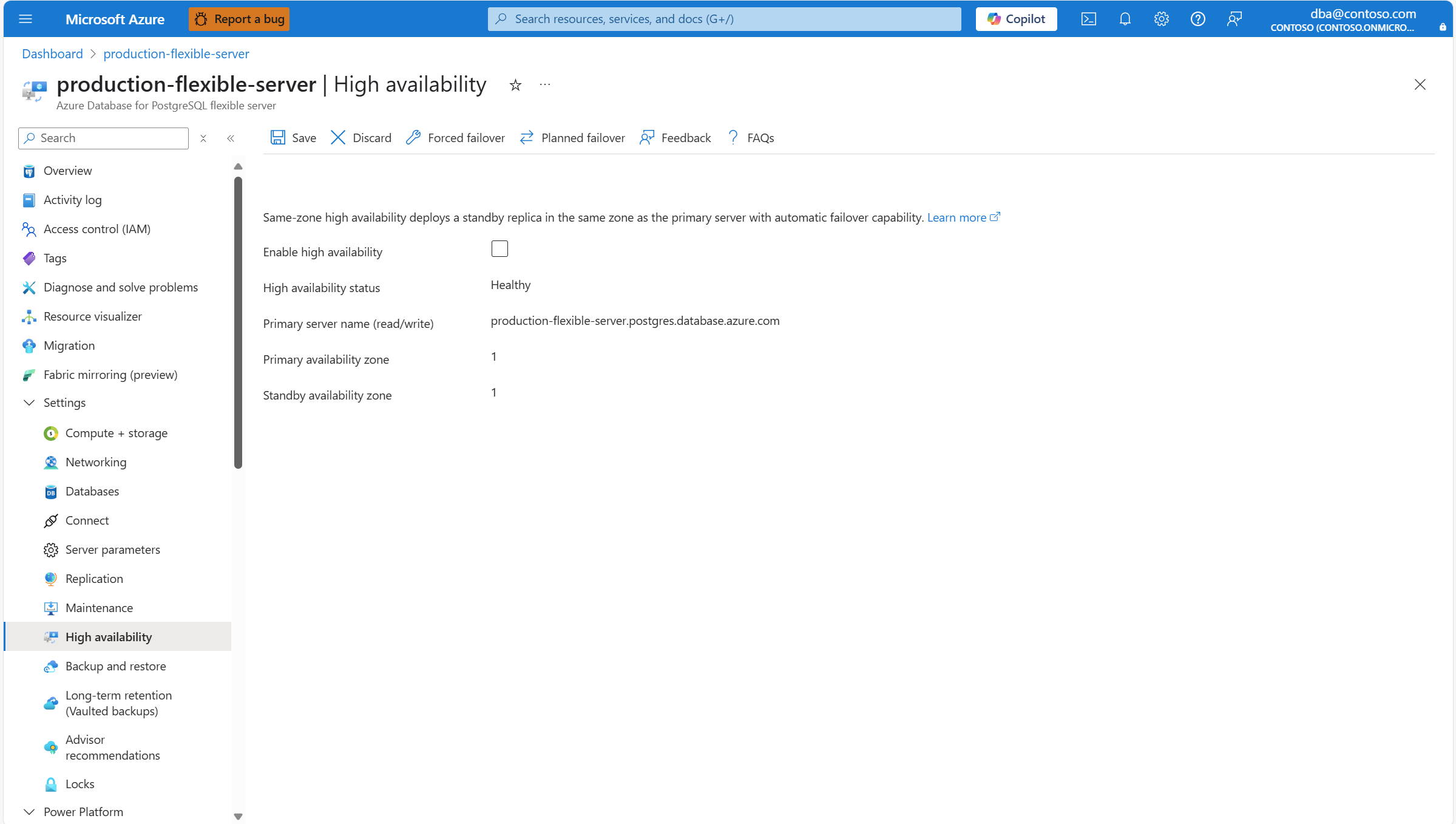 在 Azure 门户中,选择已启用高可用性的 Azure Database for PostgreSQL 灵活服务器实例。
