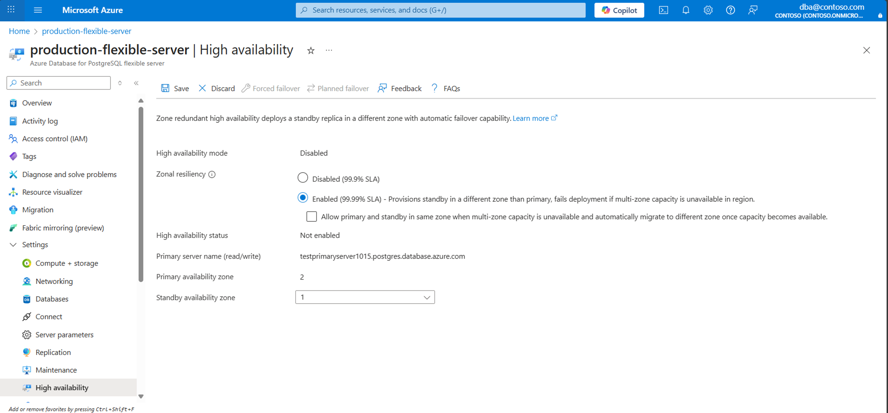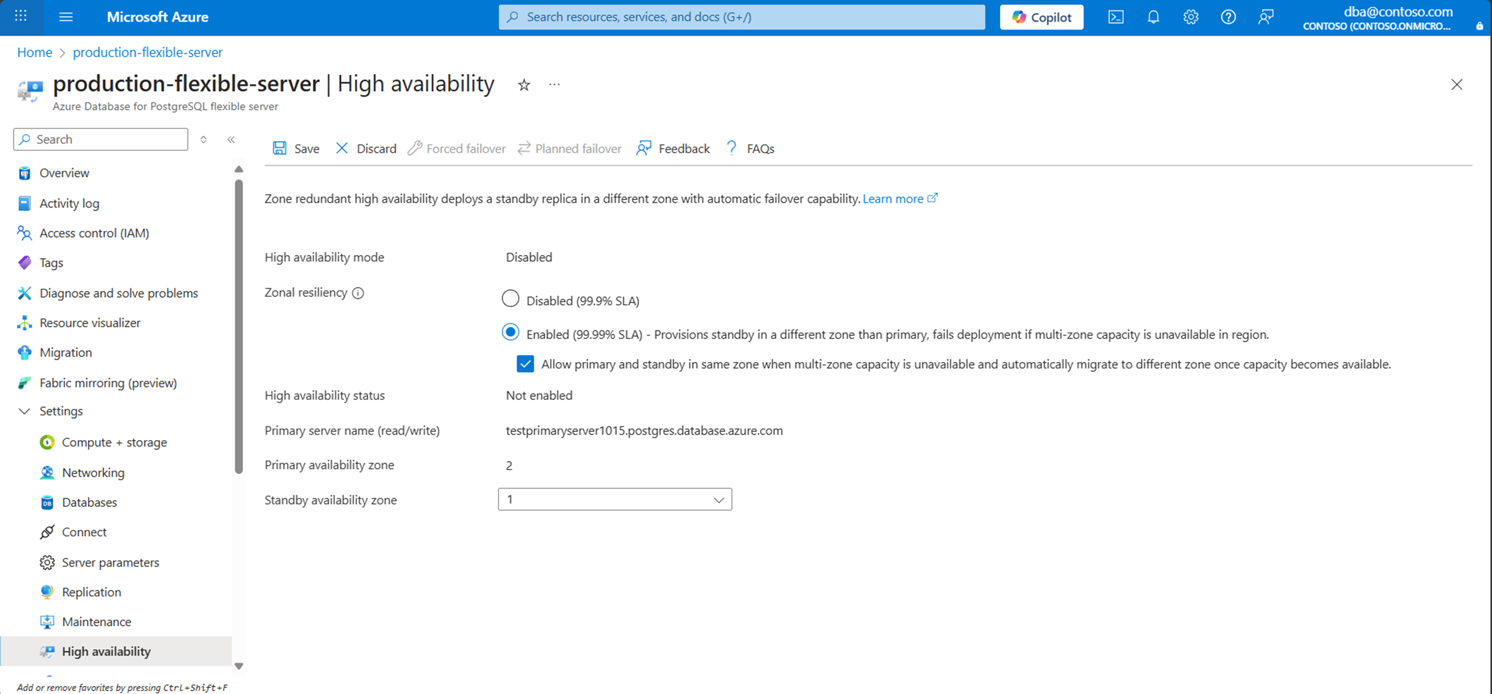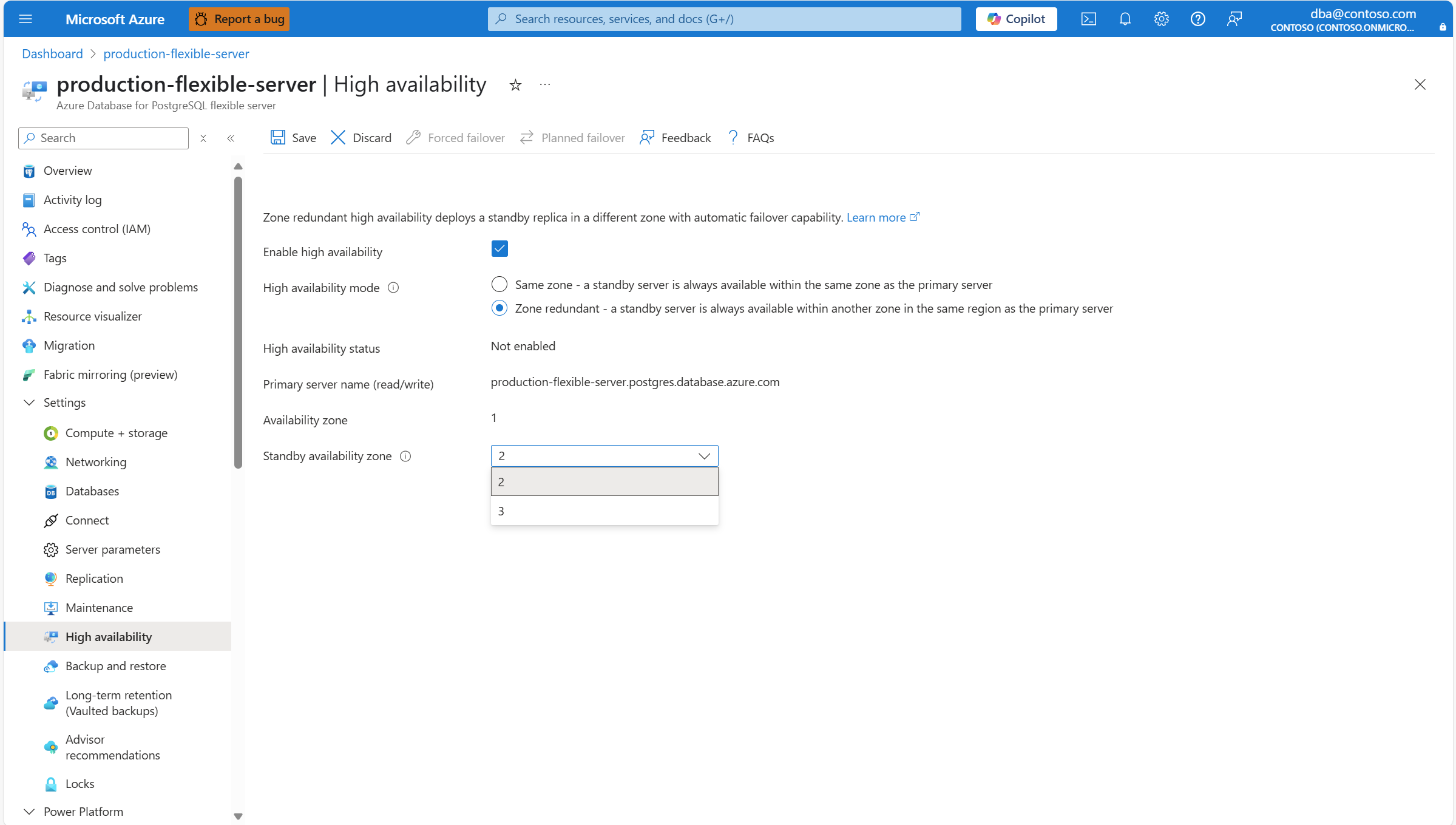 如果高可用性模式设置为 区域冗余,请注意分配给 主要可用性区域 和 备用可用性区域的值。 故障转移作完成后,应撤消它们。