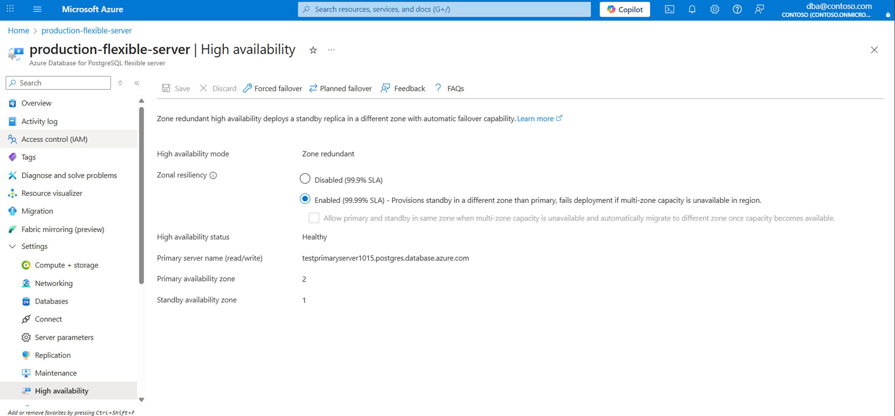 高可用性功能部署物理上独立的主副本和备用副本。 可以根据所选的部署模型,在同一可用性区域或不同区域中预配副本。 有关详细信息,请参阅 有关高可用性概念的文章。 可以在创建 Azure Database for PostgreSQL 灵活服务器实例期间或之后启用高可用性。