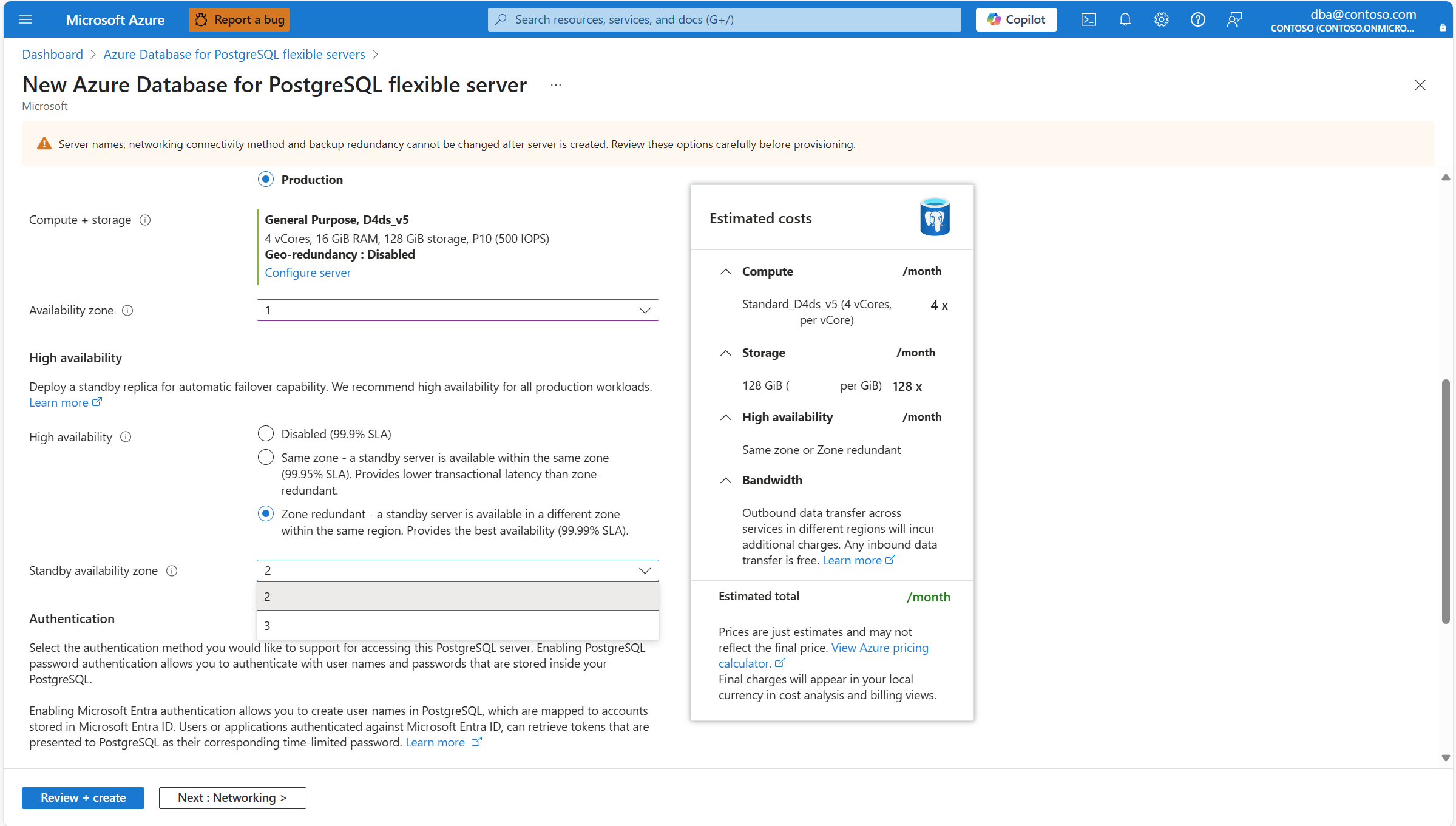 对于 备用可用性区域,可以为备用服务器选择一个值。 如果要通过将应用程序并置在数据库所在的同一区域中来减少延迟,则设置特定区域非常有用。 如果希望将备用服务器部署在服务自动选择的可用性区域中,请选择 “无首选项”。