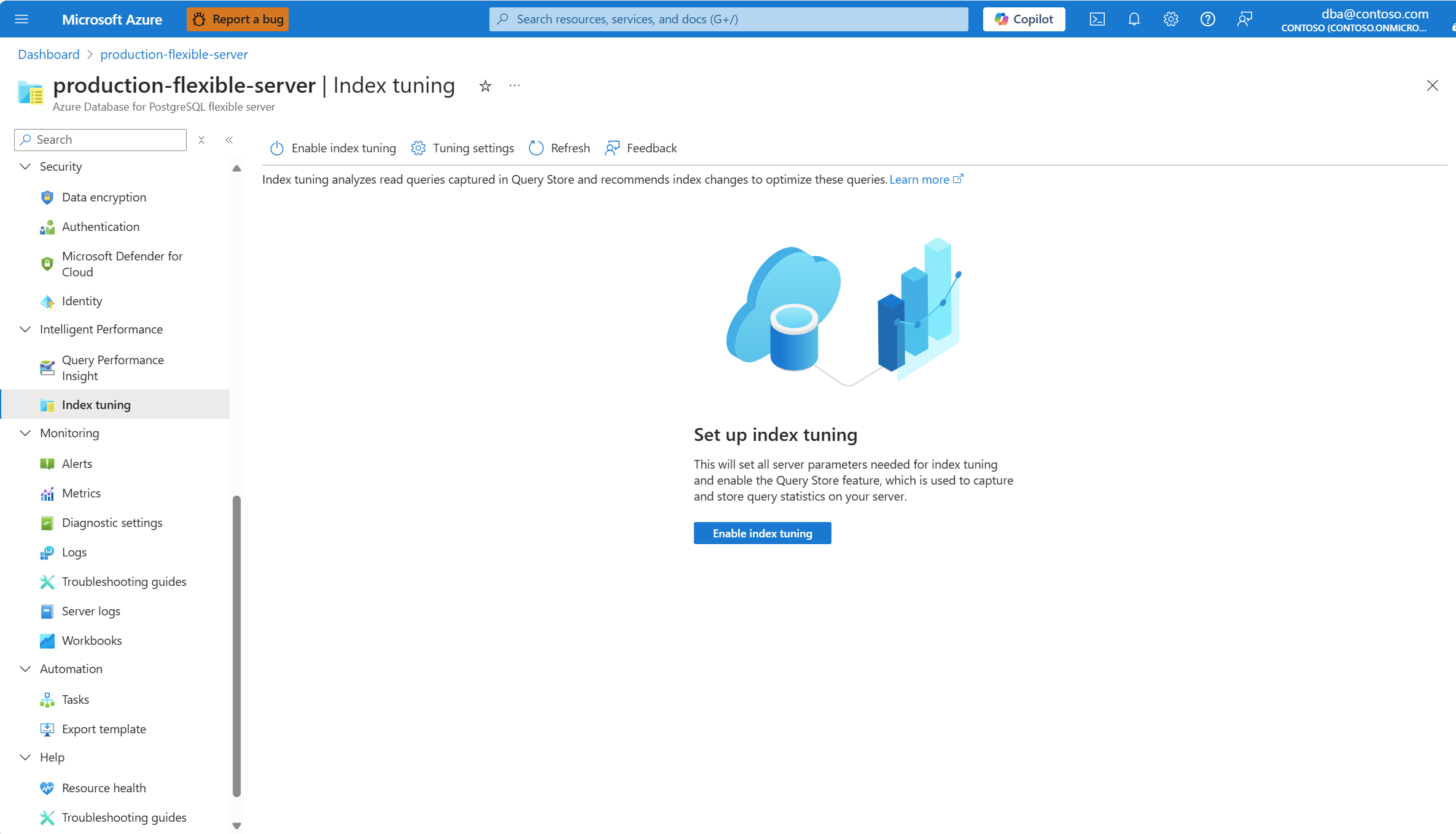 3. 如果 pg_qs.query_capture_mode 设置为 NONEindex_tuning.mode 设置为 OFF,则“索引优化”页将提供启用索引优化的选项。 如果已禁用查询存储,请选择两个“启用索引优化”按钮之一,启用索引优化功能及其所需的查询存储依赖项。