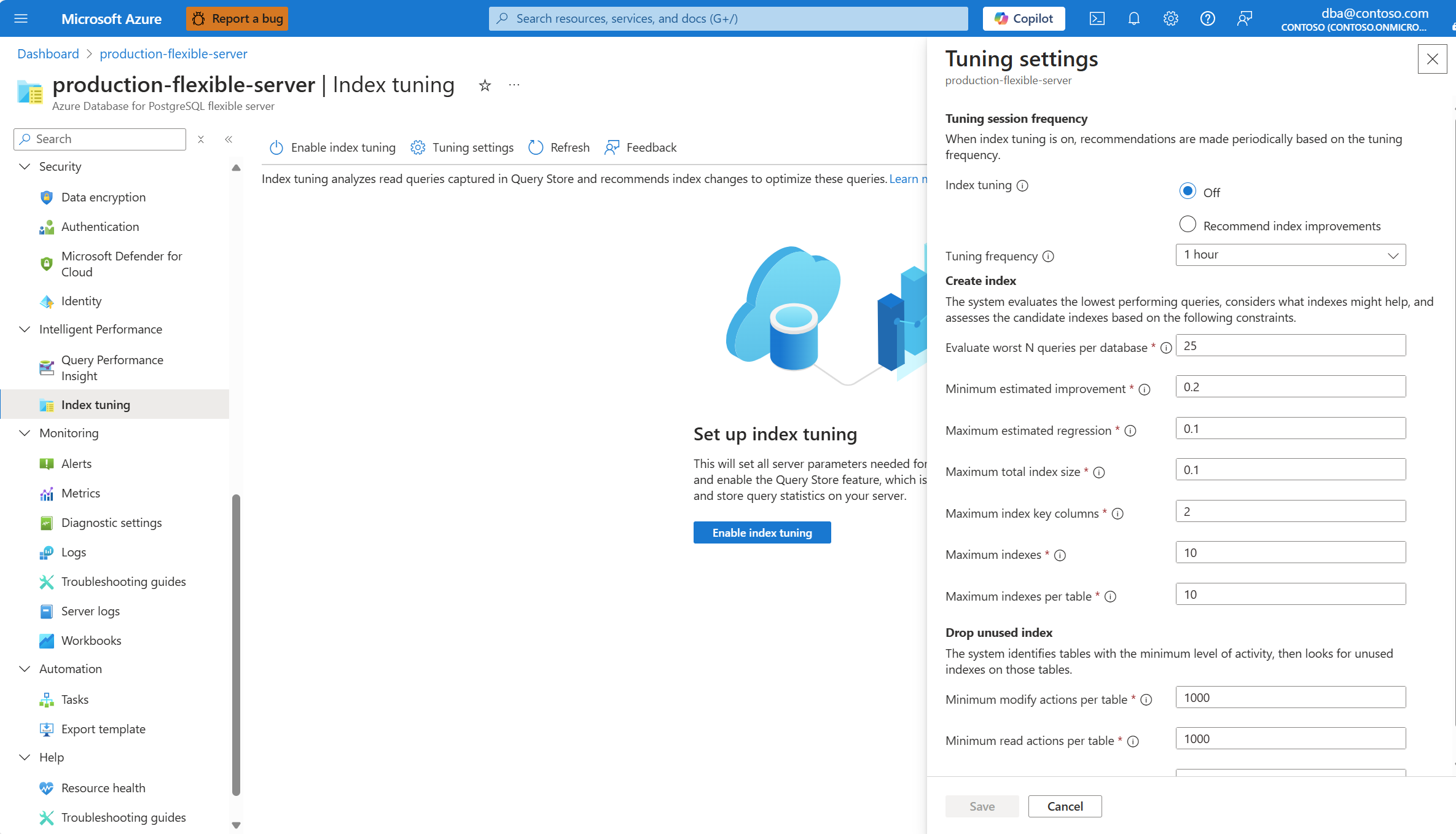 5. 启用索引优化后,允许索引优化引擎在 12 小时内分析查询存储收集的工作负载,并最终生成或删除索引建议。