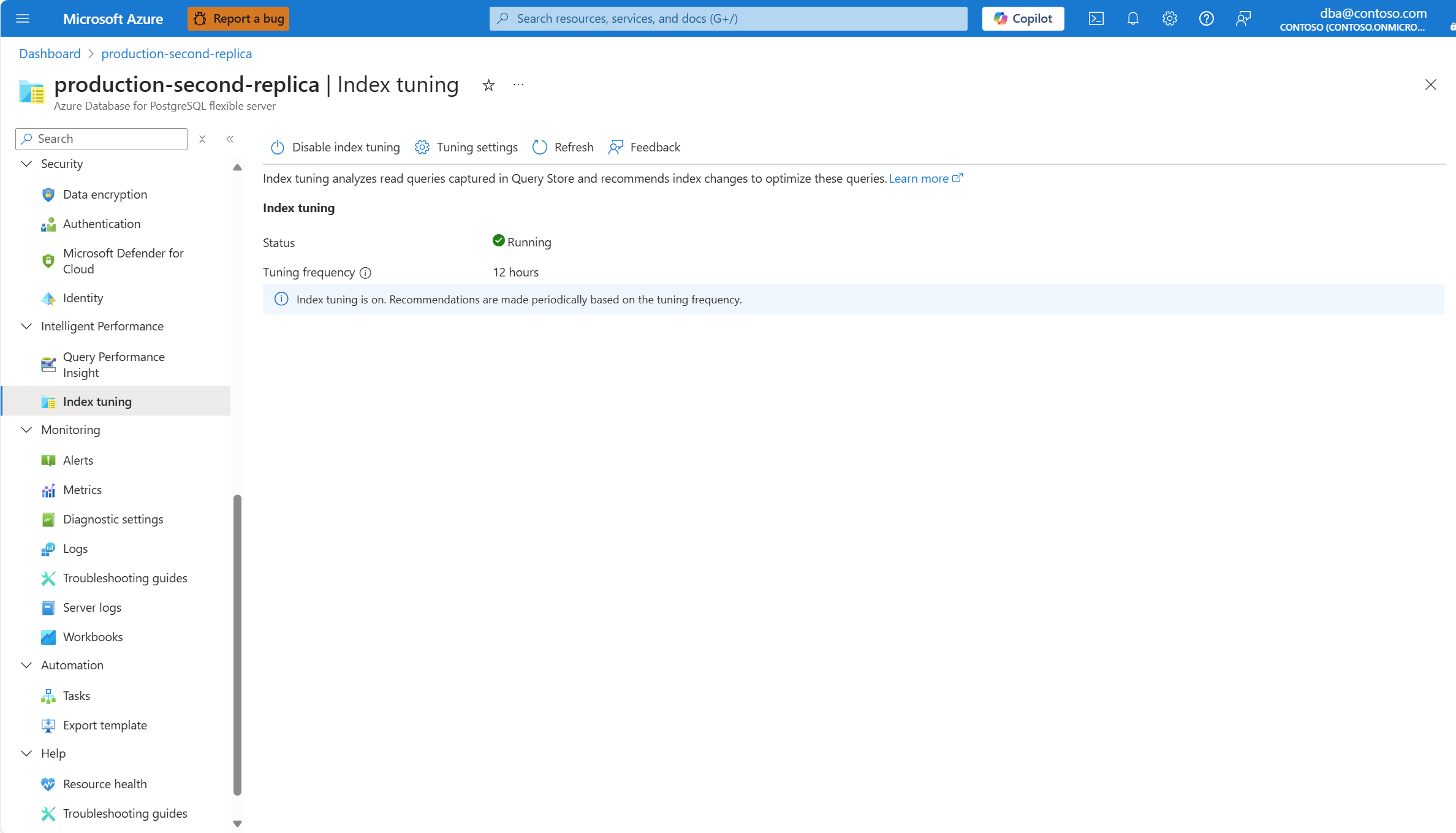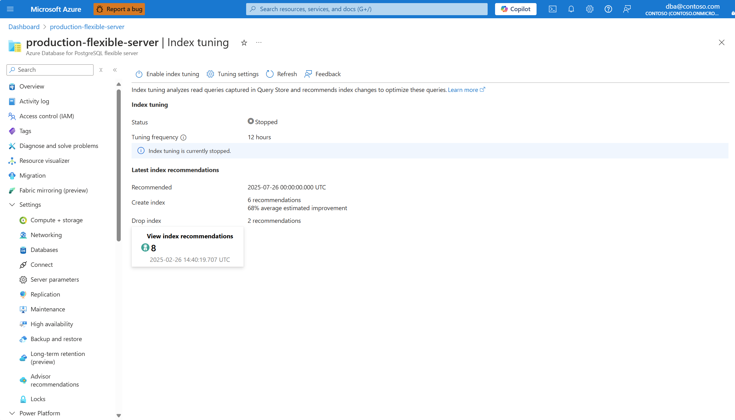 可以使用 Azure 门户中的 “索引优化 ”页或使用 Azure CLI az postgres flexible-server index-tuning list-recommendations 命令读取这些建议。