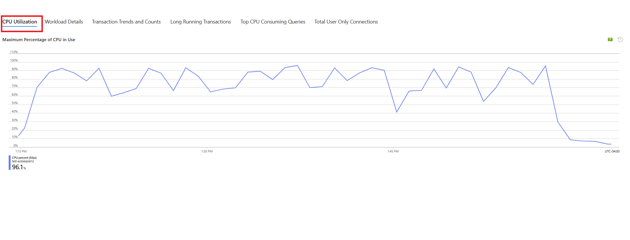 选择“查询”选项卡。其中显示了在 CPU 使用率达到 90% 的时间间隔内运行的所有查询的详细信息。 从快照来看,该时间间隔内平均执行时间最慢的查询约为 2.6 分钟,该查询在该时间间隔内运行了 22 次。 该查询很可能是 CPU 飙升的原因。